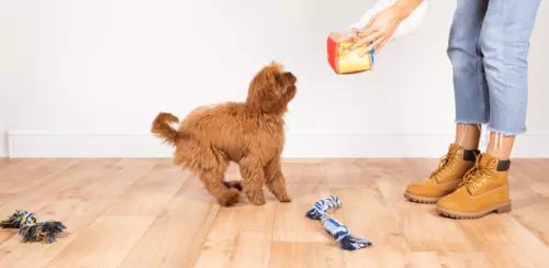 Sit on the floor in front of your puppy and start by holding a tasty training treat in front of your puppy's nose, so they know what you've got! Raise your hand with the treat up and over their head, to encourage them to lift their head to look up and naturally sit. At the same time, verbally ask your dog to 'sit' in a calm voice (saying it louder doesn't help, trust us!). As soon as your clever puppy sits, reward them with their tasty treat straight away and give lots of cuddle and praise. Practice makes perfect, so remember to repeat these steps several times a day until your puppy understands.